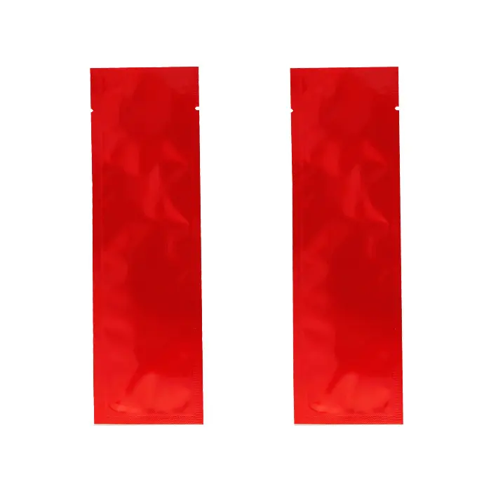 2.5" x 8.25" O.D PAKVF4C Red PMS 199C 3 side seal bag with tear notch 1.0" from open end