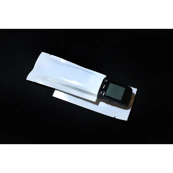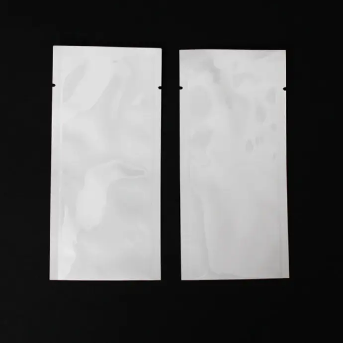 2.5" x 5.5" OD White MylarFoil MiniPouch with 0.25" side and bottom seals; tear notch 0.75" from sealed end