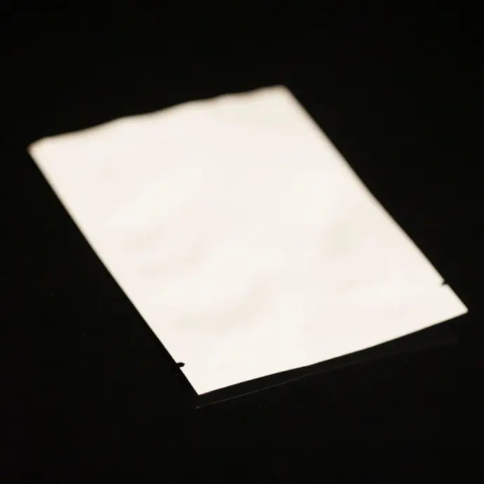 3.5" x 4.5" OD White MylarFoil MiniPouch with tear notch 0.5" from sealed end. Tamper evident and requires seal.