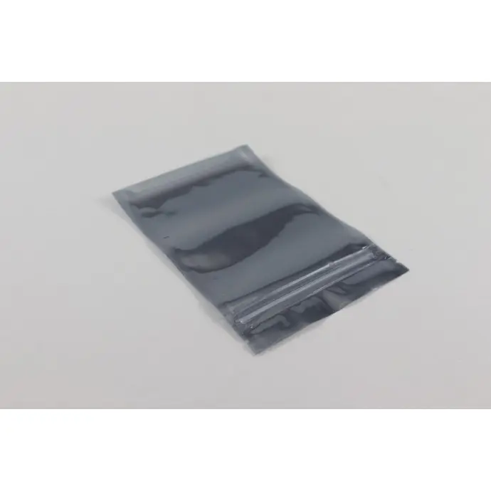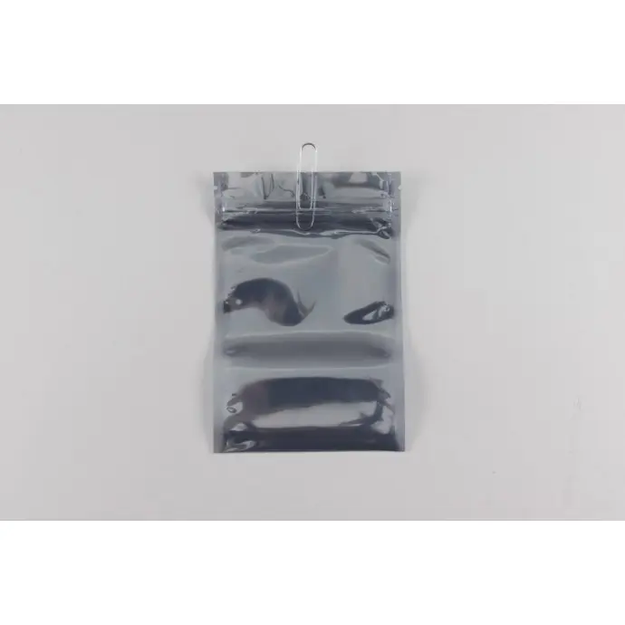 4.0” x 6.0” Smoky gray pouch; fold over bottom with tear notch and zipper. Made using our translucent silver PAKSTAT100 electrostatic shielding