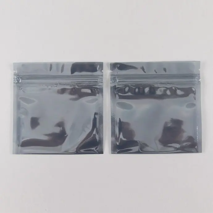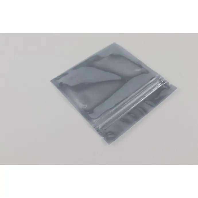 4.0” x 4.0” OD Smoky gray pouch, fold over bottom with tear notch and zipper. Made using our translucent silver PAKSTAT100 electrostatic shielding.