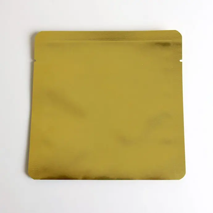 Gold 5.75 x 5.75 OD three side seal pouch with tear notch suitable for retort applications. Unprinted.