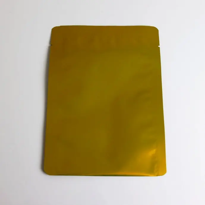 Gold 5.75 x 8.0 OD three side seal pouch with tear notch suitable for retort applications. Unprinted.