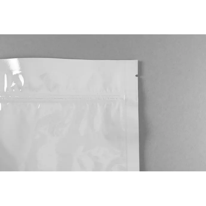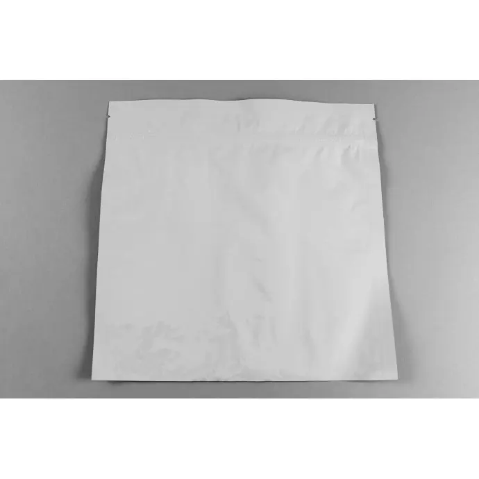 9.0" x 9.0” 3 side seal bag, 2.5mil Foil laminate White MylarFoil, Tamper Evident Zip Seal and tear notch on closed end