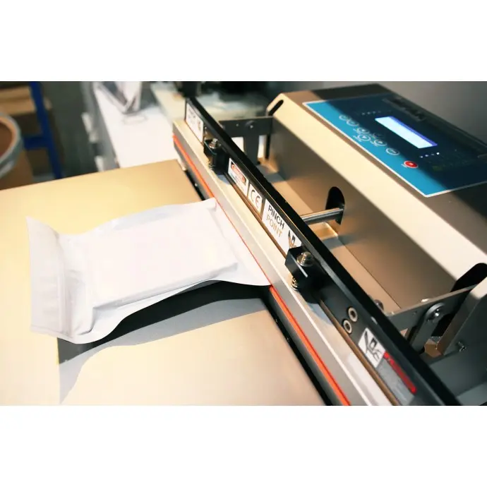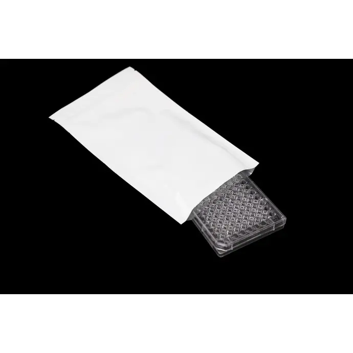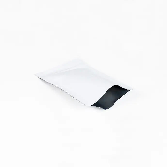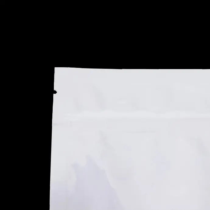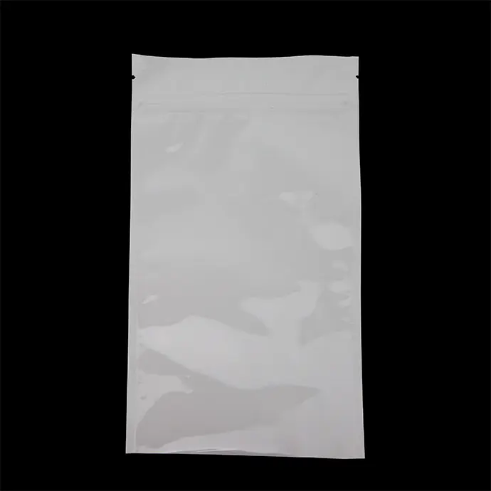 5.5" x 9.5" O.D. White PAKVF4CNW MylarFoil Pouch with tamper-evident zipseal 1.25" from top closed end and tear notch 0.5" from top closed end.