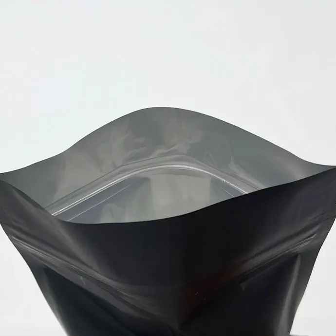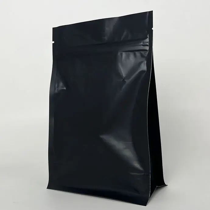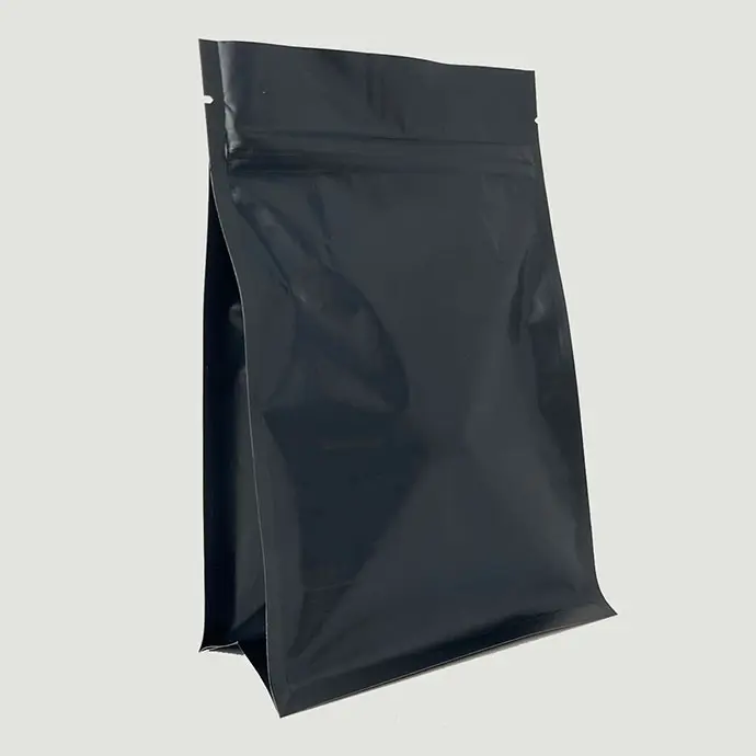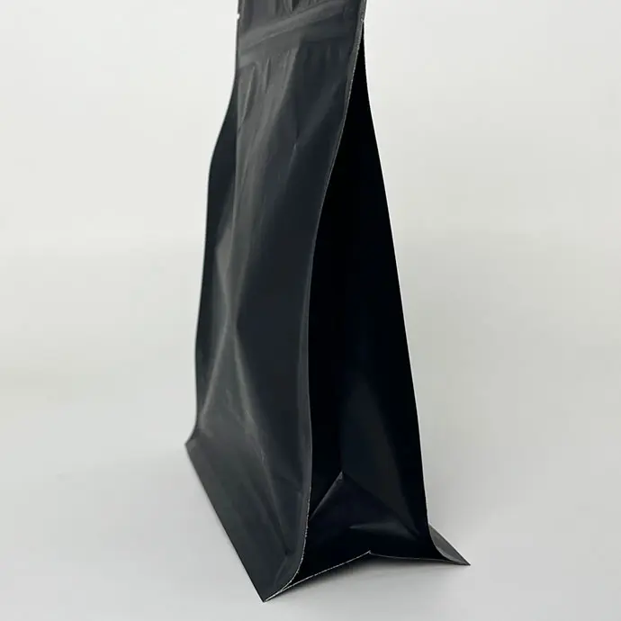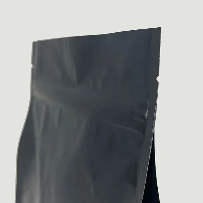 5.5" (w) x 8.25" (h) x 2.75" (d) PAKVF4 Matte Black block bottom standing pouch with Side Gusset, Zipper and Tear Notch.