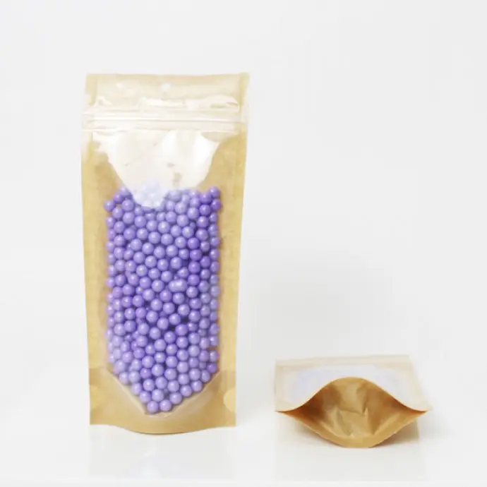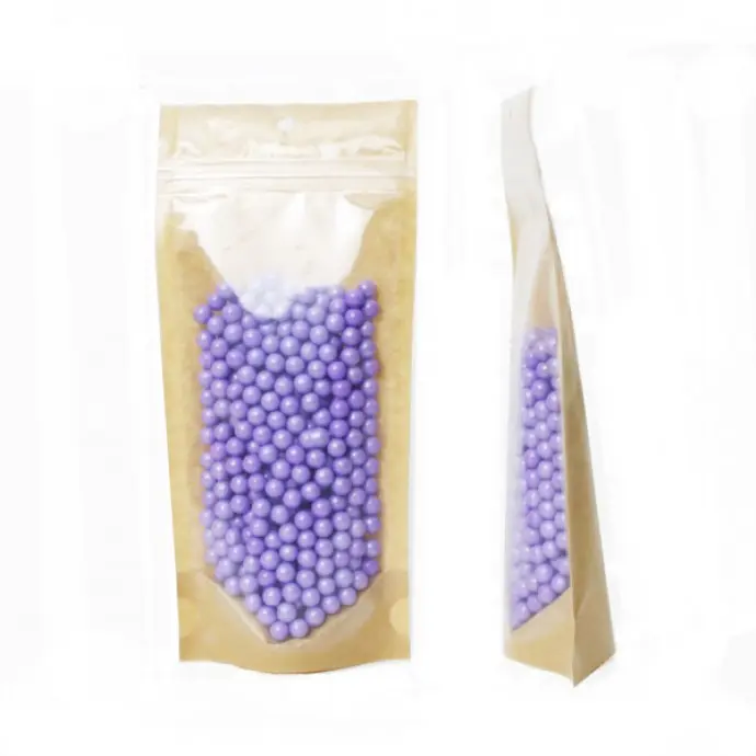 This kraft paper vista pouch, featuring a clear window for product visibility, is a popular choice for visually appealing items that require protection from moisture and oxygen.