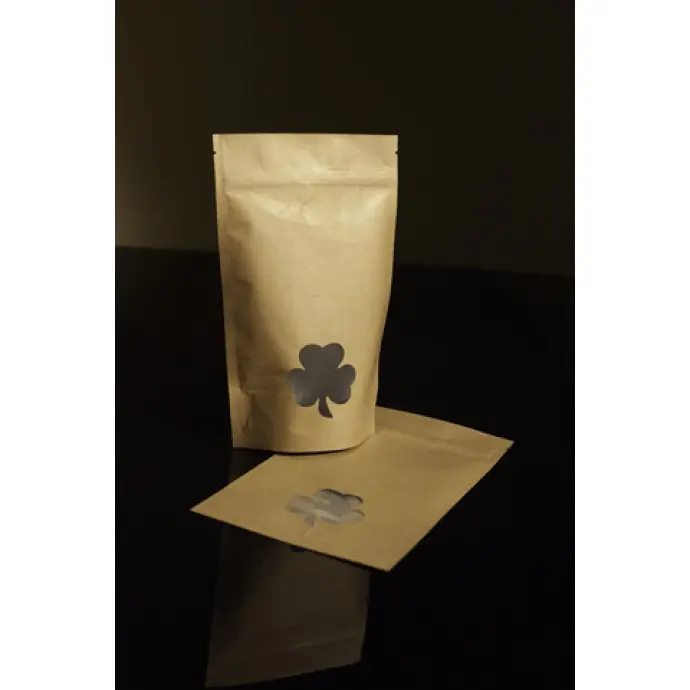 This fun Shamrock themed pouch is made using high quality Kraft material for a great earthy look ready for printing, and a stable bottom for Standing Pocuhes and provides a high barrier to moisture and oxygen.