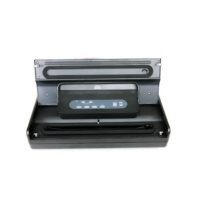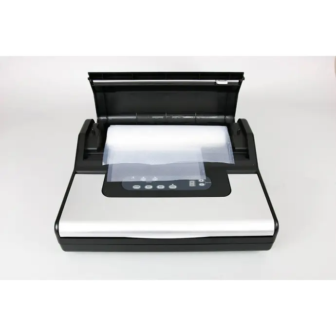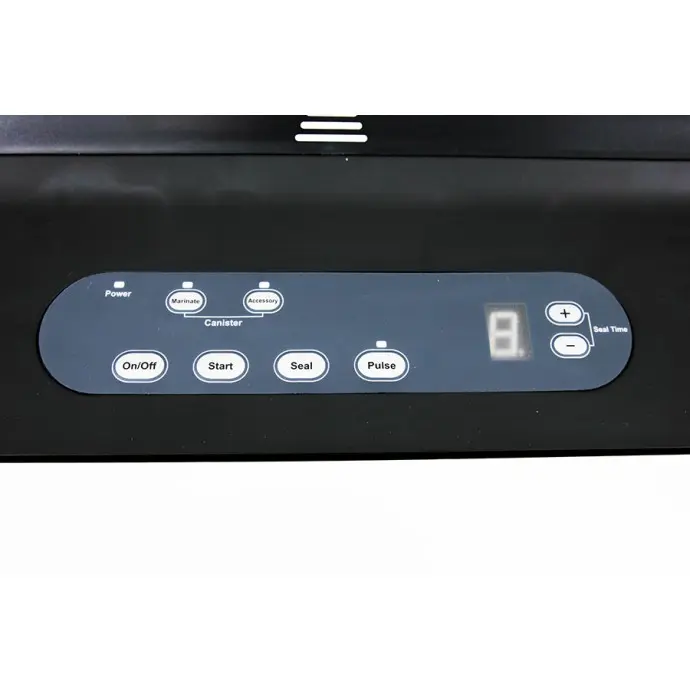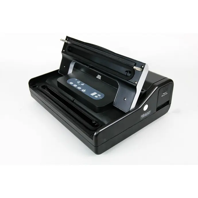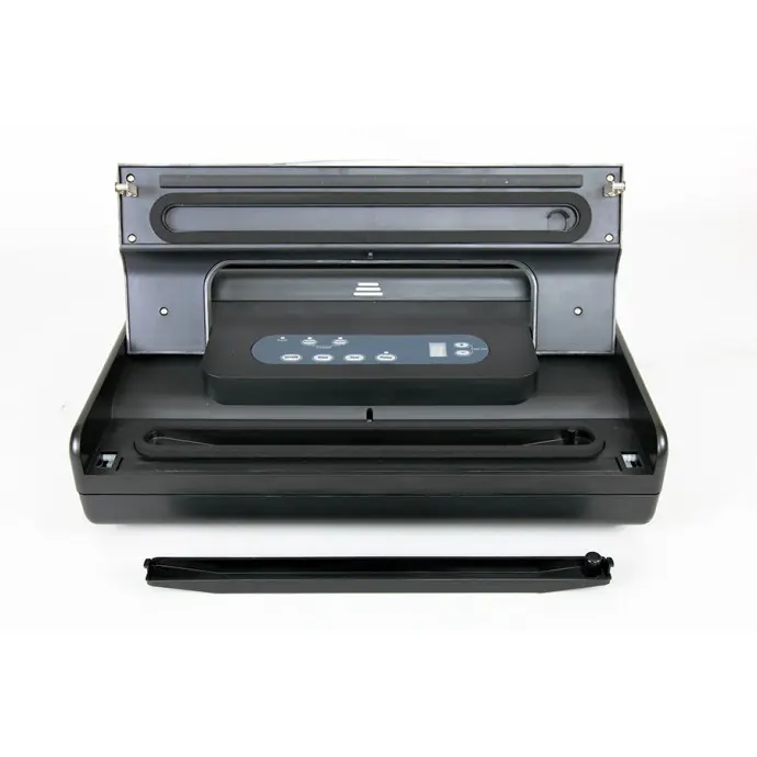 The all-in-one sealing system: includes a built-in roll dispenser with cutter, and built in vacuum hose with storage compartment (hose and adaptor included). Seals textured vacuum bags up to 12.2” wide. Easy snap close and seal operation with digital display and adjustable vacuum and seal time. Special design prevents liquid from entering pump, and removable sauce tray makes clean up easy.