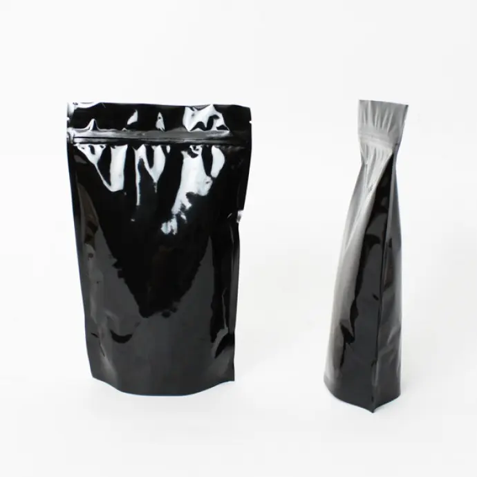 6" x 9.375" x 3.25" OD Black MylarFoil stand up pouch with zipper and tear notch. (Rounded Corners)