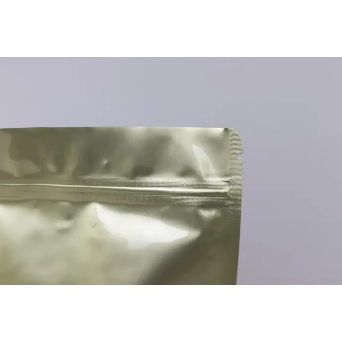 6" x 9.375" x 3.25" OD Pale Gold MylarFoil stand up pouch with ZipSeal rounded corners and tear notch