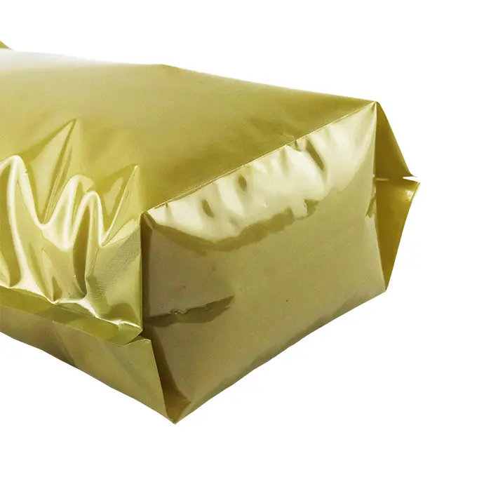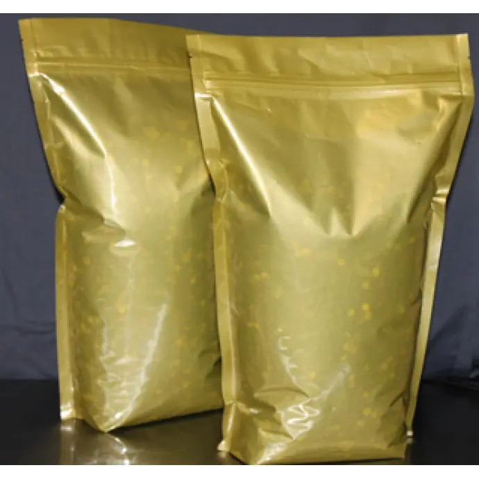 This large, food-safe stand up pouch features a "plow bottom" gusset designed to accomodate heavy contents. It also has a secure recloseable zipper, tear notches for easy opening, and a translucent gold film structure that allows contents to be slightly visible.