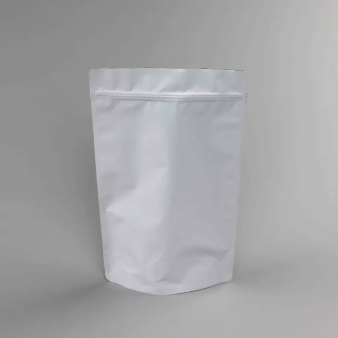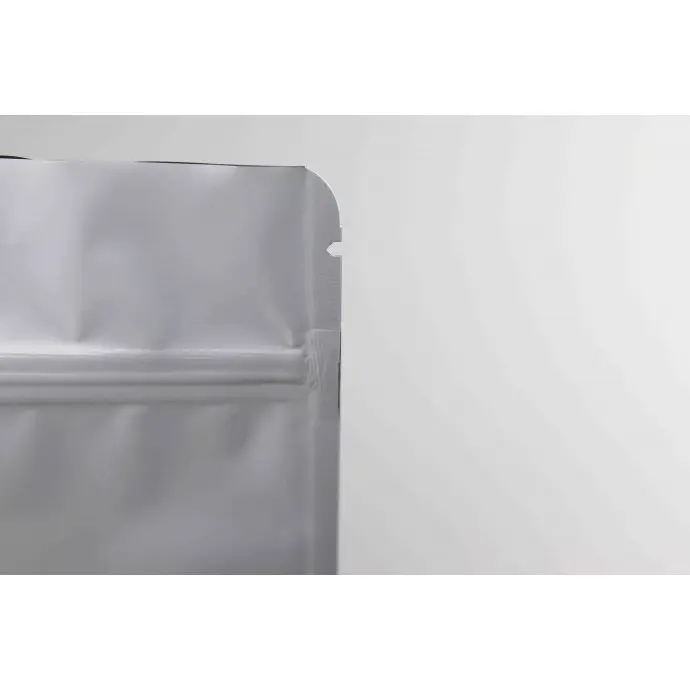 6.69" x 11" x 3.5" OD Matte White MylarFoil Stand Up Pouch with Zipseal, Tear Notch, and Rounded Corners