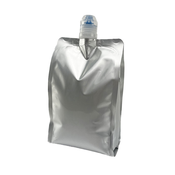 5.0" x 3.0" x 9.75" O.D. PAKVF6CN Silver SpoutPAK™ with side gusset and tamper evident flip top cap.