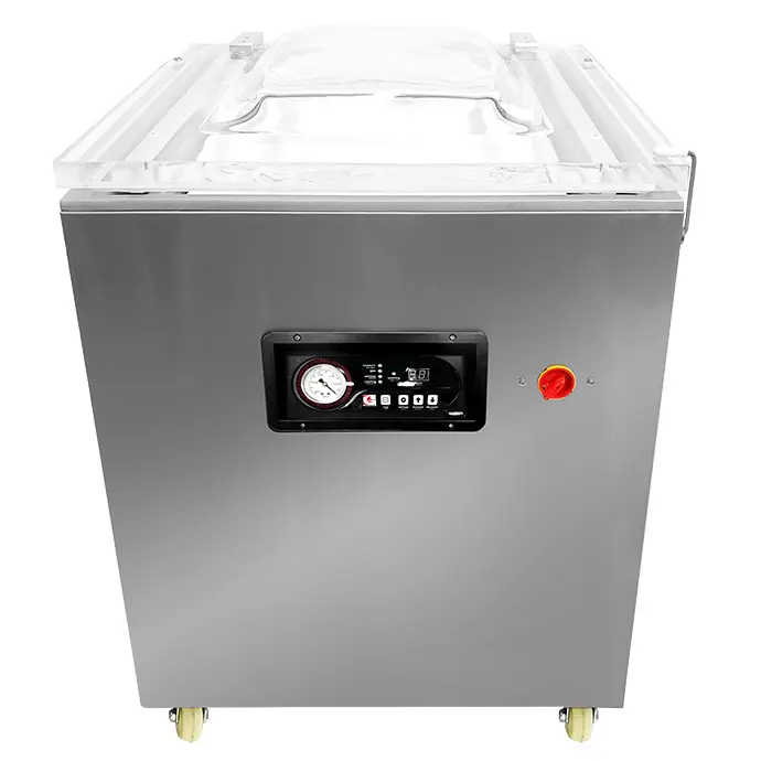 The model GCV-24LR is one of the larger single chamber sealers in our Castle Vac Chamber Sealer line. This freestanding unit sits on wheels to move around the production area. Built with simple efficiency in mind, the Castle Vak line was designed to develop a chamber sealer body that can better fit in relatively small work spaces. Each comes with a thick transparent acrylic lid to see the process when sealing, and twin Vane oil lubricated vacuum pumps to deliver a 48m3/h flow rate (two 1 1/4 hp pumps at 24m3/h).