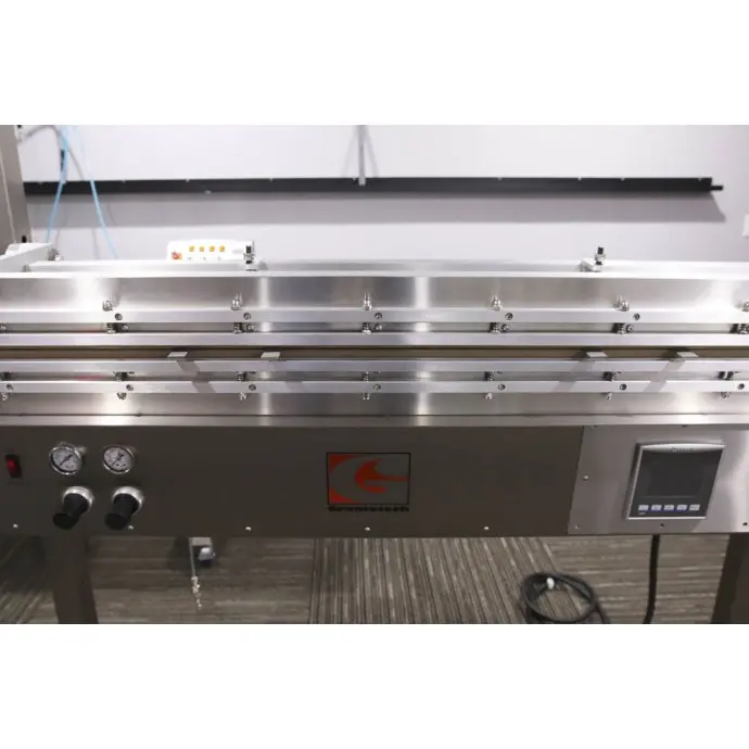 This tabletop vacuum sealer is made from high-grade 304 stainless steel and an aniodized aluminum frame. It's perfect for medium to high production use and comes with dual 0.25" heating elements, Unitronics color touch screen, single-ported exhaust, Venturi vacuum pump, and dual retractable nozzles as standard features.