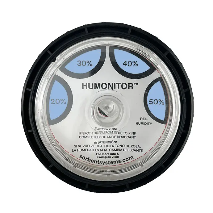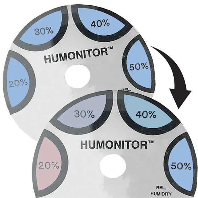 The HUMONITOR® is designed for any project that needs to maintain strict humidity levels and be able to quickly and accurately confirm the RH inside of a sealed package. Cut a small hole in your high barrier bag of choice, screw the Humonitor® in place from both sides, and view the included circular 20% 30% 40% 50% Humidity Indicating Card to see the RH inside the package.