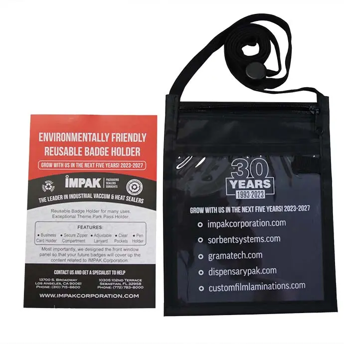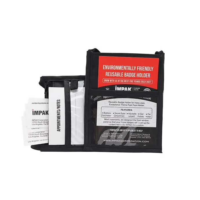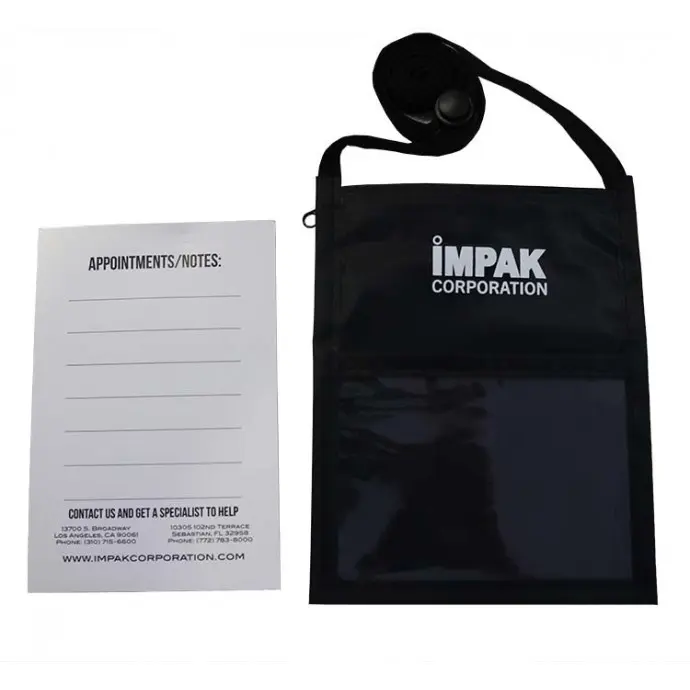 The worlds best trade show badge holder is here. Throw out those annoying lanyards and step up your convention preperation with the IMPAK Custom Badge Holder. Featuring a front and back pocket to hold your badge, along with a note card or small notebook. Each comes with a sewn in adjustable lanyard afixed at the corners to avoid badge spinning, a pen loop, and a zipper middle pocket for any extra cards or sample you pick up along the way. The IMPAK branding was also hidden behind the badge pockets to make sure your information is the only thing people focus on when they look at your badge.