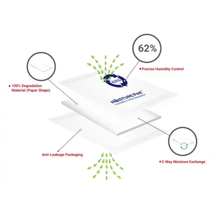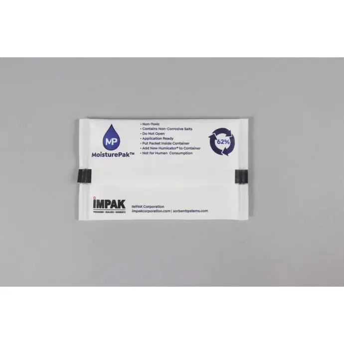 What does it do? ? It keeps your product at a stable relative humidity, not too wet and not too dry. Our MoisturePak™ has been designed to maintain a 62% relative humidity (±3% RH) inside a sealed container such as a jar or bag.