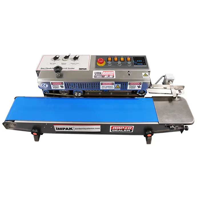As a natural addition to our highly successful VakRapid series of continuous band sealers, the IMPAK VakRapid 2.5 continuous band vacuum and gas flush sealers set the standard for high speed bagging of food, medical, pharmaceutical and electronics applications that require optimum freshness and shelf life. The VakRapid Series provides high quality, hermetic seals on all moisture-barrier bag materials. The vacuum and nitrogen gas flush system removes up to 99% of oxygen, depending on the application, and creates a low moisture package. It is an ideal solution for food, medical, pharmaceutical, electronics and other products that need added protection against decomposition. The gas flush system also can be used to create a cushion like buffer to protect contents from damage. The VakRapid is economical when compared to other sealers that offer nitrogen gas flushing for air removal. The VakRapid model includes a vacuum cycle after gas flushing to allow virtually oxygen free vacuum-sealed product bags. Additional options include a stainless steel stand with casters for portability, embossing or dry print letter kit and a spare parts kit.