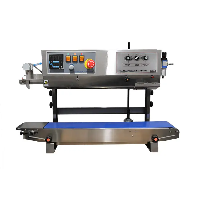 As a natural addition to our highly successful VakRapid series of continuous band sealers, the IMPAK VakRapid 2.5 continuous band vacuum and gas flush sealers set the standard for high speed bagging of food, medical, pharmaceutical and electronics applications that require optimum freshness and shelf life. The VakRapid Series provides high quality, hermetic seals on all moisture-barrier bag materials. The vacuum and nitrogen gas flush system removes up to 99% of oxygen, depending on the application, and creates a low moisture package. It is an ideal solution for food, medical, pharmaceutical, electronics and other products that need added protection against decomposition. The gas flush system also can be used to create a cushion like buffer to protect contents from damage. The VakRapid is economical when compared to other sealers that offer nitrogen gas flushing for air removal. The VakRapid model includes a vacuum cycle after gas flushing to allow virtually oxygen free vacuum-sealed product bags. Additional options include a stainless steel stand with casters for portability, embossing or dry print letter kit and a spare parts kit.