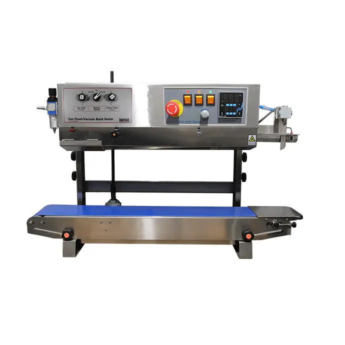 As a natural addition to our highly successful VakRapid series of continuous band sealers, the IMPAK VakRapid 2.5 continuous band vacuum and gas flush sealers set the standard for high speed bagging of food, medical, pharmaceutical and electronics applications that require optimum freshness and shelf life. The VakRapid Series provides high quality, hermetic seals on all moisture-barrier bag materials. The vacuum and nitrogen gas flush system removes up to 99% of oxygen, depending on the application, and creates a low moisture package. It is an ideal solution for food, medical, pharmaceutical, electronics and other products that need added protection against decomposition. The gas flush system also can be used to create a cushion like buffer to protect contents from damage. The VakRapid is economical when compared to other sealers that offer nitrogen gas flushing for air removal. The VakRapid model includes a vacuum cycle after gas flushing to allow virtually oxygen free vacuum-sealed product bags. Additional options include a stainless steel stand with casters for portability, embossing or dry print letter kit and a spare parts kit.