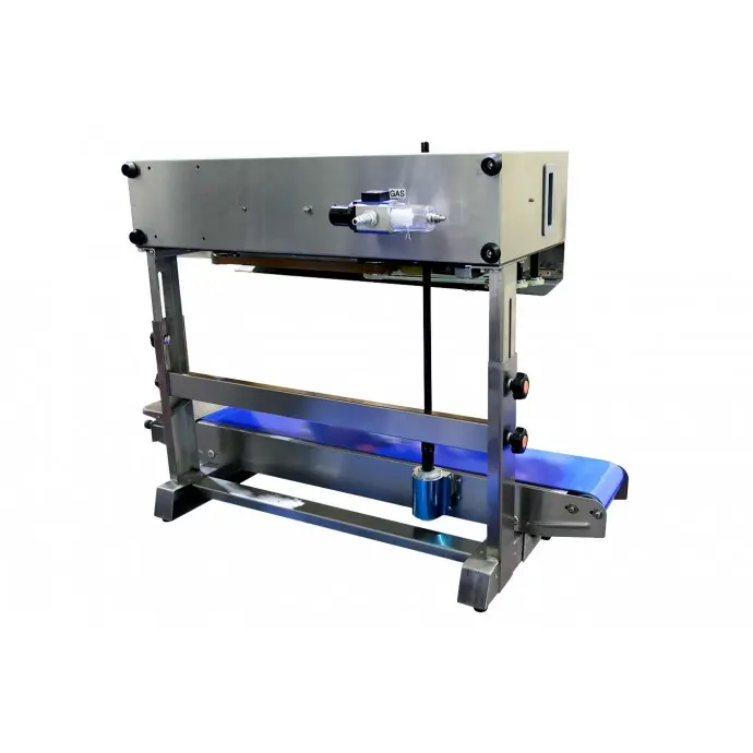 A continuous band sealer equipped with a gas flush system to remove oxygen and provide cushion for delicate products.
