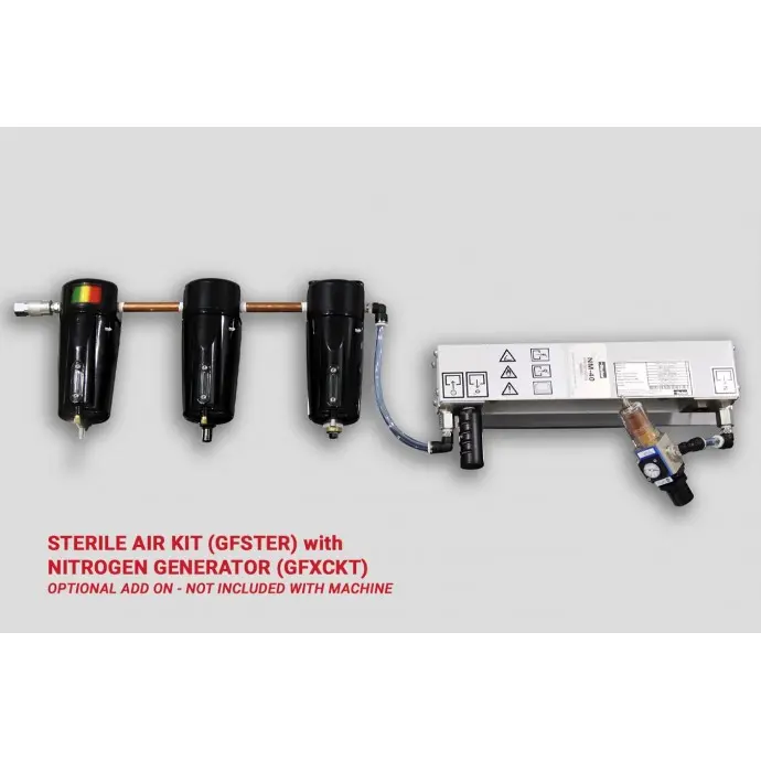 Two Pre-filters with PM indicators which remove contaminants and water from the compressed air line before they reach the nitrogen generator. After leaving the generator the air is pushed through a Post filter which results in a Sterile Nitrogen flow of 99.9999+% efficiency at 0.01 micron. This is essential for food and sensitive applications where purity is critical.
