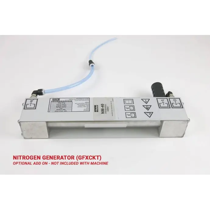 The machine may be used in conjunction with several gas types but most typically is used with nitrogen. Where space is a concern, IMPAK offers a Nitrogen Generator that converts oxygen to nitrogen and eliminates the need for a bulky tank.