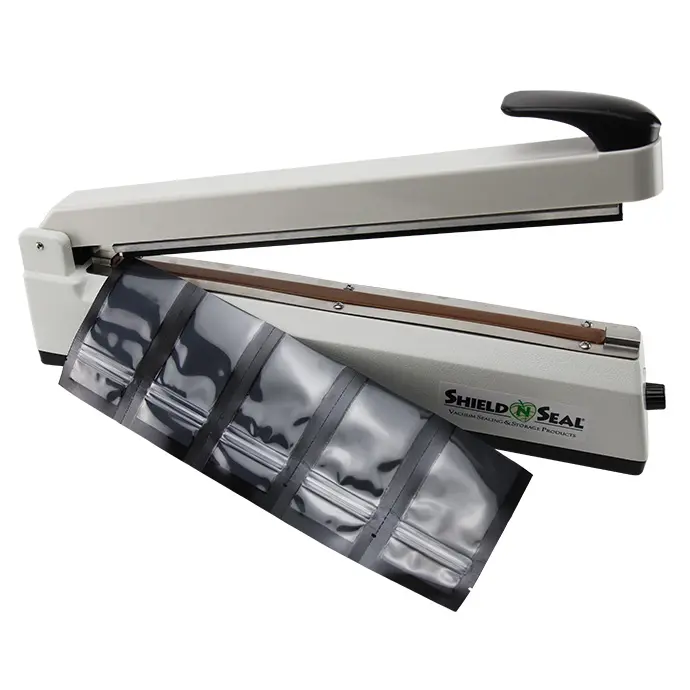 Our friends over at Shield N Seal offer a 15" tabletop impulse heat sealer. This is a great way to upgrade from comparable models like those sold by Harvest Right™ or Uline™. The 405mm long, 5mm wide heating element creates a reliable seal on bags up to 15" wide. The 580 Watt power supply also means a faster heat up time when activated.