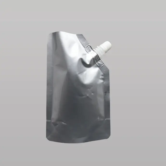 4.5" x 7" x 2.5" OD Silver PAKVF56PFN (Aluminum Foil/Nylon/LLDPE) Stand Up SpoutPAK™ bag with Tamper Evident Cap, 8.6mm Inner Diameter. (≈ 3/8" I.D.)