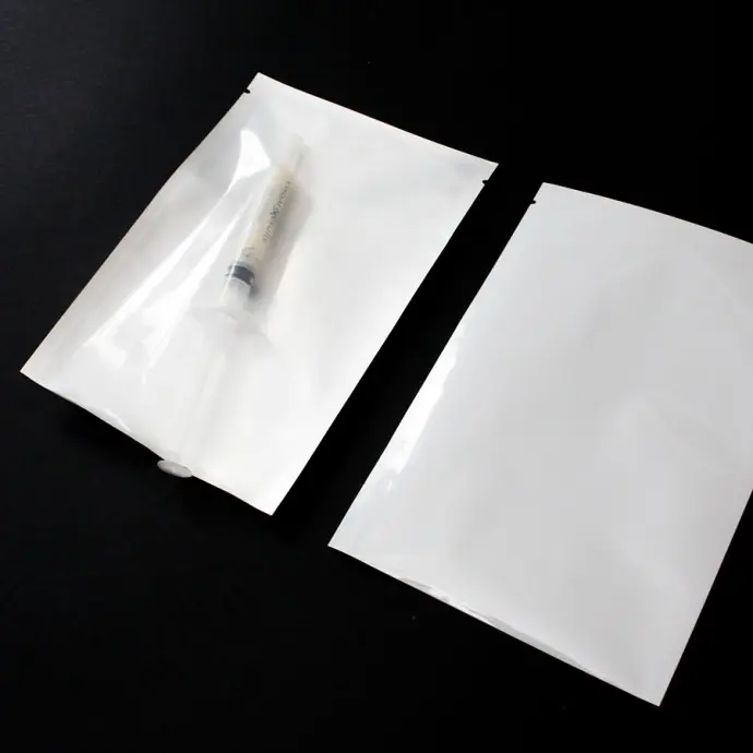 4.25” x 6.0” MylarFoil pouch with 3 sealed sides and tear notches 0.75” from sealed end. Clear face, silver inside, white back. Tamper evident and requires seal.