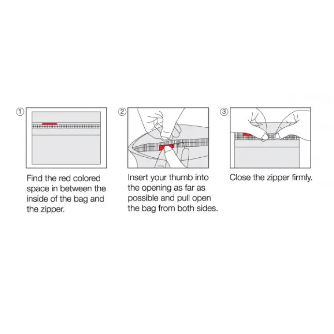 An ingenious thumb tab makes the zipper easy to open for adults, but nearly impossible for children. Follow the diagram on the bag and opening becomes almost as easy as your average sandwich bag. Reclose it for multiple uses. Contents are protected from children with every close.