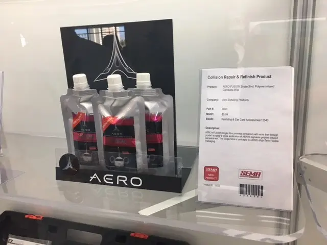 AERO’s specialty wax is packaged in a flexible spout bag from IMPAK and was recently on display in the New Products Showcase at SEMA, the world’s premier automotive products tradeshow held yearly in Las Vegas, Nevada.